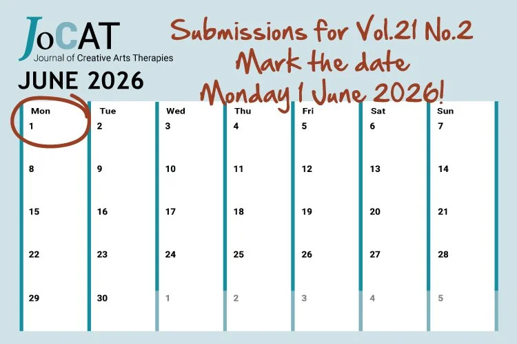 Welcome to the Journal of Creative Arts Therapies (JoCAT), the home of the creative arts therapies research community. JoCAT is the open access peer-reviewed publication of ANZACATA in association with the School of Social Sciences, Western Sydney University.