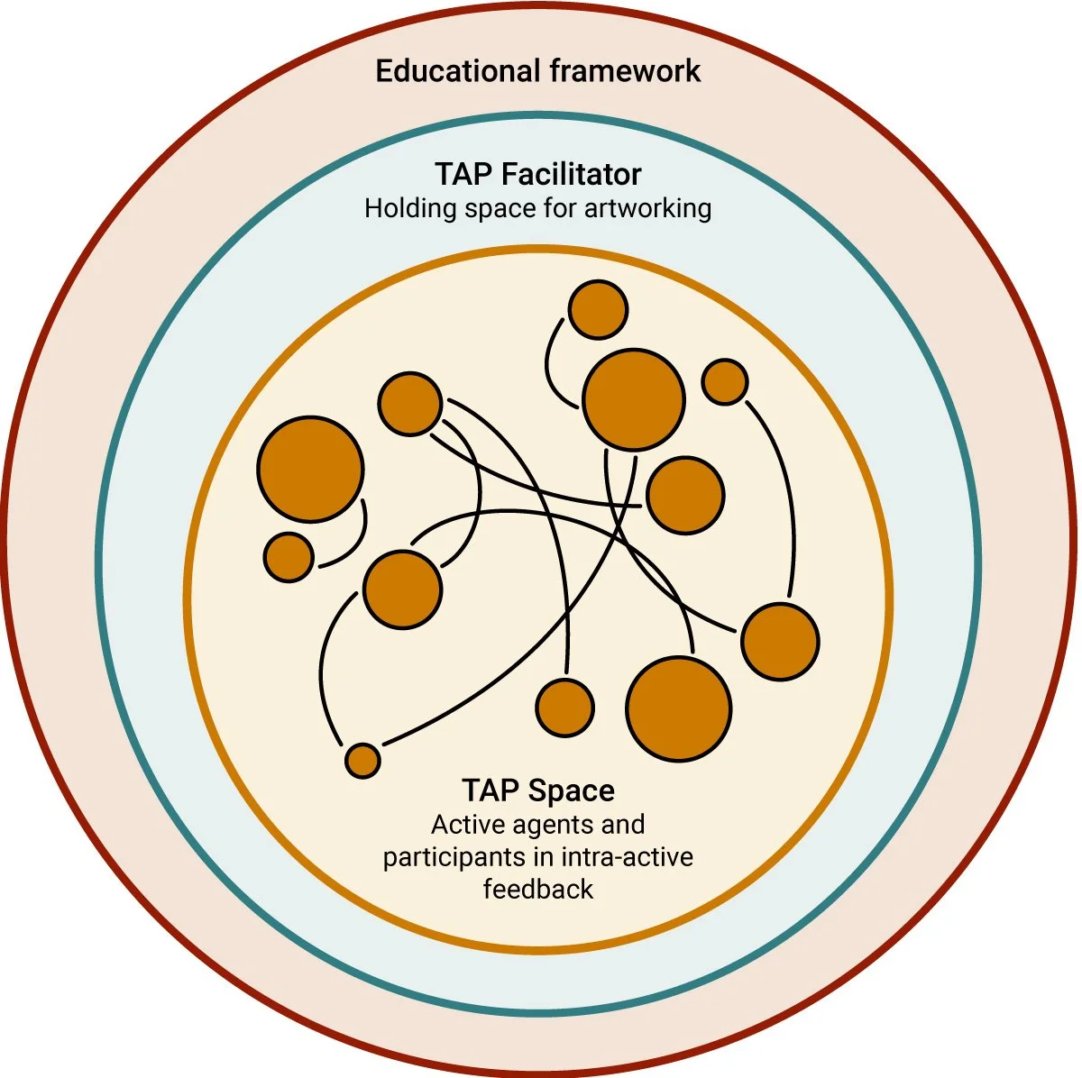 There are many ways to embed creativity, visual arts, well-being, and learning within pedagogy. This article has illuminated one such approach through TAP, a program with interwoven research-informed practices at the intersection of art therapy, education, and the visual arts. Run from 2020 and researched in 2023, TAP provides educational settings with vital creative spaces aimed at the development of more complex and abiding learning dispositions and strategies for well-being. TAP’s relational philosophy, principles, and practices provide educational settings with bespoke frameworks that nonetheless remain responsive to specific pedagogies. These frameworks offer creative spaces for artworking, a practice informed by new-materialist perspectives, positioning both human and non-human elements as dynamic agents in the creative process. The program’s adaptive framework supports its efficacy across a variety of educational settings, celebrating diversity, connection, embodied learning, and reflexivity as core elements of the educational experience.