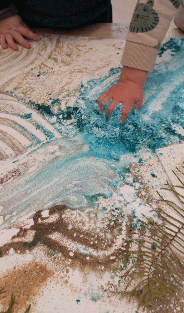 The TAP program was explained, explored, and exemplified in an arts-based research project completed in 2023. Data were gathered from therapeutic art play conducted in a toddler room with children aged one to three and their accompanying adults. The morning programs were facilitated on Wangal land (in Sydney’s inner-west). These involved interactions with sand, flowers, shells, and stones. The shells and stones were gathered from and, where possible, returned to Dharawal Country along the coast of southern New South Wales. Included also were plaster, matt board, scoops, containers, and water. Data took the form of photographs of artworking and artworks, naturalistic observations, questionnaires, and recordings. In addition, the researcher/TAP facilitator gathered data from their own artworking in response to the research process. Taking part in lively creative process art allowed for the consideration of human and non-human interactions (Taylor, 2017). An analytic framework based on aspects of theories of new materialism enabled a diffractive analysis, as outlined below, that puts on display the characteristics and impacts of the TAP program.