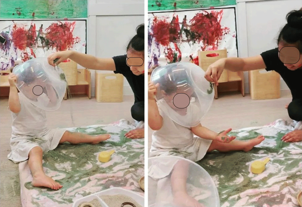Most of the participants have drifted away and the art materials are spread on the floor. M carefully scoops green sand into a bowl and, with a delighted smile, tips it over her head, watching the grains cascade down the edge of the bowl and onto her chest before brushing them off and repeating the ritual. Beside her, P skilfully balances a child on her knee and supervises children moving through the bathroom. M looks through the transparent bowl at P and smiles. P grabs a handful of sand sprinkling it onto the top of the bowl, they watch the sand run down the outside of the bowl and laugh together. I notice the rhythm of their actions and the graceful way P joins the moment without disrupting its flow, embodying a seamless interplay of teaching and creativity. We notice and reflexively discuss my observation of the artworking. P is surprised by how much I notice, I am surprised by how creative and responsive P’s teaching skills are, we are both delighted by the power of M’s play. I realise the depth and complexity of these intra-actions, the validation and extension of play rituals, the connections and empathy being displayed. This simultaneous experience of being, becoming, and belonging is a privilege to witness in the richness of this shared TAP space. This witnessing provides an opportunity to develop a practice of deeper noticing, and critical and mindful reflection.