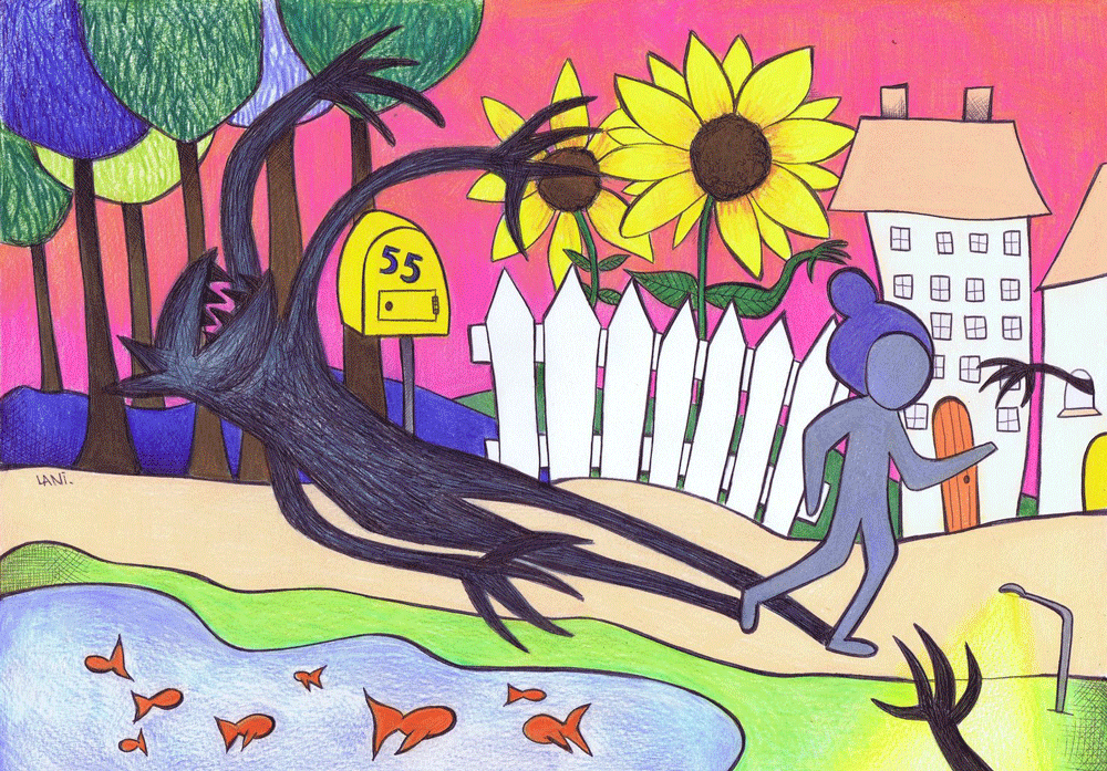 I drew this artwork in 2023, wanting to capture some of the experiences described by the people I worked with as an art therapist. The bright colours indicate a seemingly pleasant suburban setting, including a white picket fence, trees, sunflowers, a fishpond and a footpath. However, on a closer look: the sunflowers are too large, and one of them has a claw and is reaching for the protagonist figure in the drawing. There is a large wolf like beastly shadow following the figure, a suggestion that fear, danger, and traumatic memories are right there, as close as one’s own shadow, creeping upon the figure.