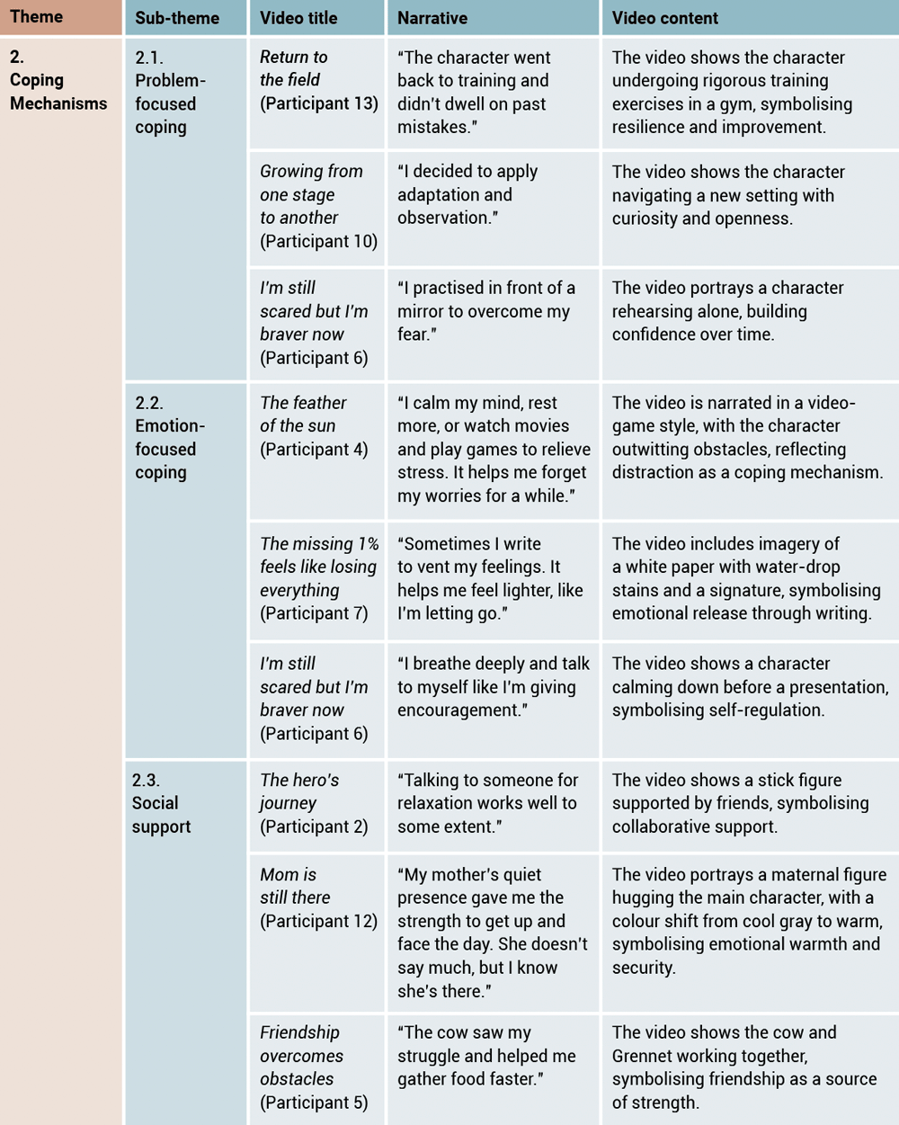 Table 2. Themes, sub-themes, video title, narrative, and video content – Coping Mechanisms.