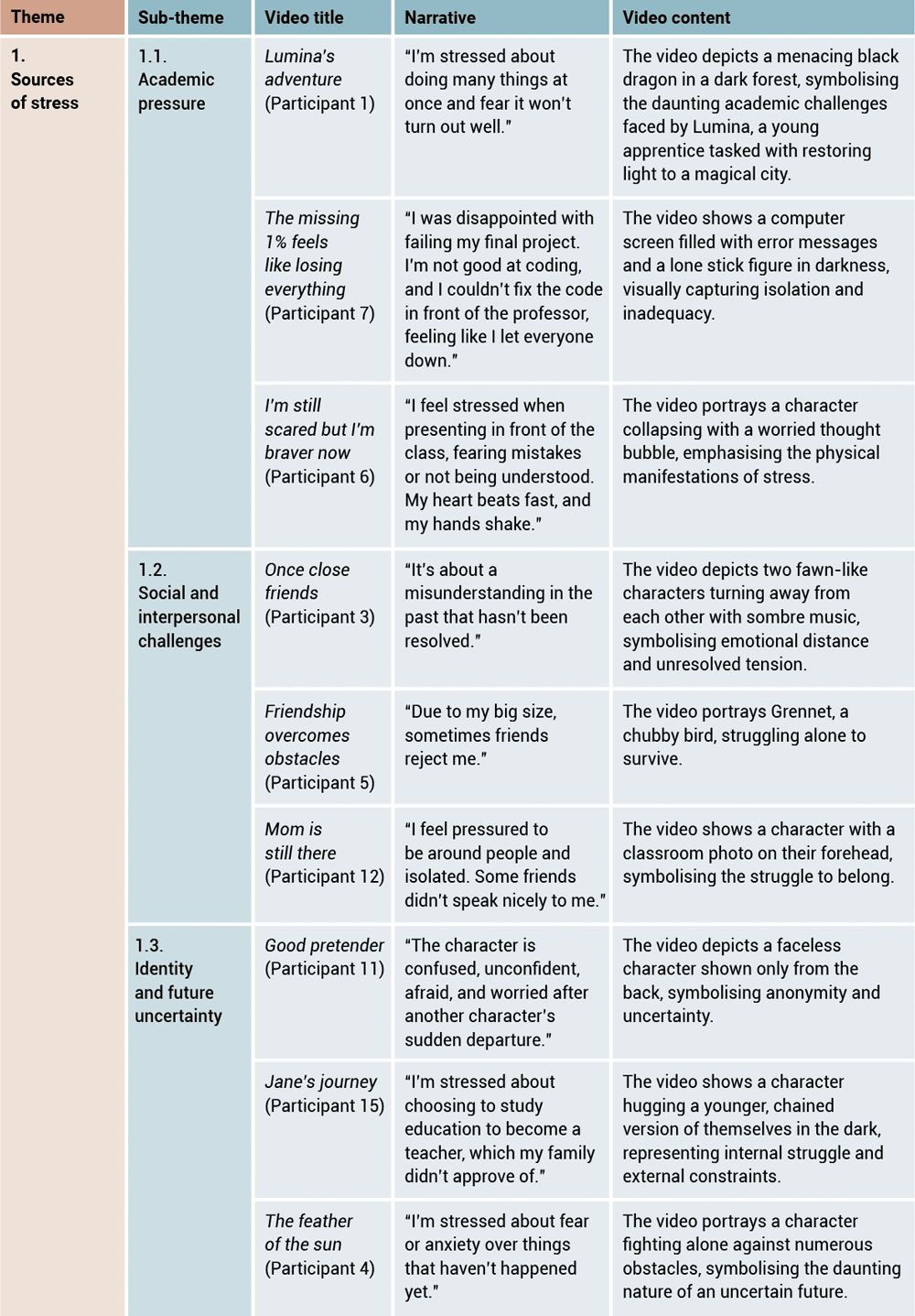 Table 1. Themes, sub-themes, video title, narrative, and video content – Sources of stress.