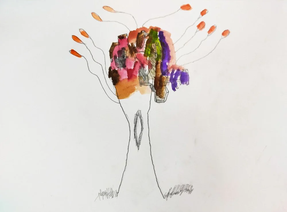 Tailoring also took the form of metaphor and imaginative prompts, which provided access to aspects of Sebastian’s identity that might have otherwise remained out of reach. When invited to imagine himself as a type of tree, Sebastian initially said he would be a shrub. After a moment of reflection, however, he changed his mind, saying he would like to be a large, 200-year-old oak tree quietly watching the world from a distance. This shift in imagery suggested not only a yearning for resilience and stability, but also revealed a capacity for playfulness and insight. The artwork he created that day, a bright, eccentric “alien tree” (Figure 4), spoke to both his sense of otherness and his creative inner life. In this space, metaphor became a language through which contradictory self-states could be expressed without judgment.