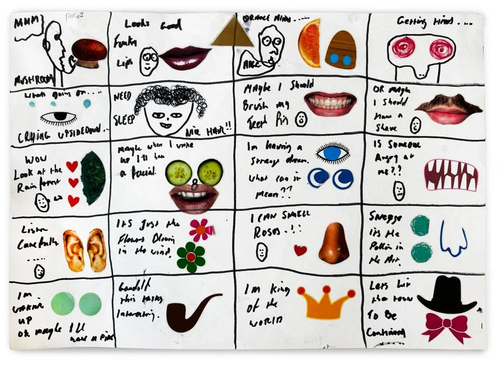 Adaptation extended to the structure of therapeutic activities. When a timeline activity elicited anxiety due to gaps in memory and the disorientation of institutionalisation, the therapist proposed a comic-strip format. The structured panels created a sense of sequence and containment, making it easier for Sebastian to revisit difficult experiences without becoming emotionally overwhelmed. This method, often used in trauma-informed graphic storytelling (Hagert, 2017), allowed him to engage with autobiographical material at a safe distance. One resulting comic (Figure 5) featured a surreal narrative involving magic mushrooms, a tennis star, and a wedding in the Swiss Alps. While fantastical, the imagery offered rich insight into his longings, coping strategies, and fractured yet resilient sense of self.