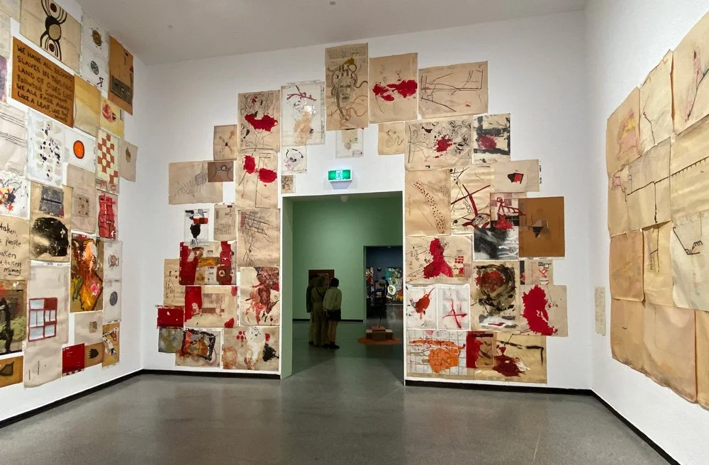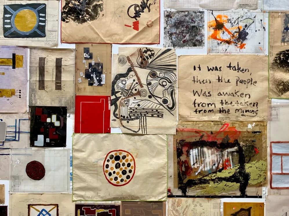 Figure 6. Tennant Creek Brio (Rupert Betheras and Joseph Williams Jungarrayi), Gateway (wound) series, 2024, installation of various works in pencil, graphite, ink, acrylic and oil on found mining maps, 5350 × 6200mm (installation).