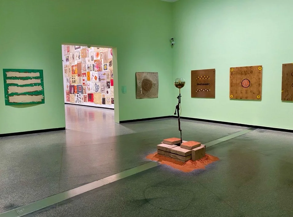 In the third room, the walls were painted green, “a nod to the palette of institutional control strewn across the central desert” (Slade, 2024). Lindsay Nelson Jakamara’s ceremonial markings painted on Masonite board calmly re-asserted and reclaimed Aboriginal cultural authority. In the middle was the sculpture Lifting Country by Jimmy Frank Jupurrula. It incorporates a glass and steel “celestial orb connecting earth and sky” (Tennant Creek Brio and ACCA, 2024), from which emanates a soundscape entitled Cosmic Mother by Brio collaborator, Mudburra and Garrawa woman Eleanor Jawurlngali Dixon. In making the mudbricks that are the foundation for this sculptural piece, Jimmy Frank Jupurrula acknowledges the need for better housing for First Nations communities and references his work with Wilya Janta, an initiative to build Aboriginal housing using local knowledge and materials. Several of The Brio artists live in tin shacks with no electricity or running water.
