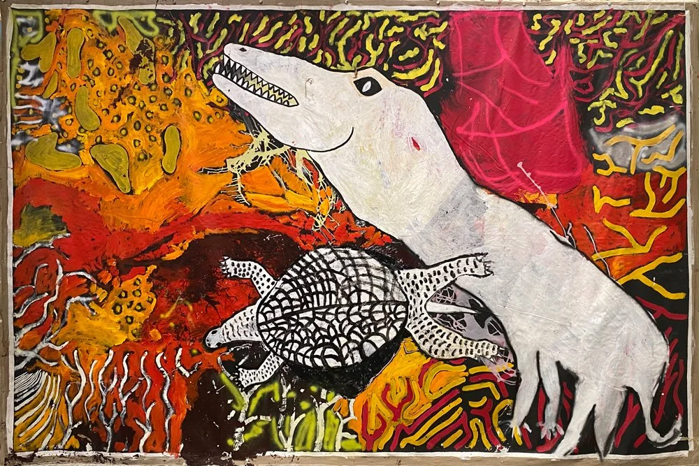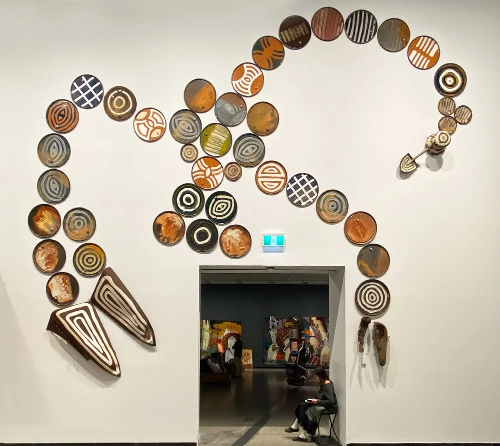 The exhibition was a major survey of work created over a ten-year period by Tennant Creek Brio, an Aboriginal men’s art collective. As its title implies, the exhibition embodied “the Brio methodology of collaborative creolisation and bricolage” (Delany, et al., 2024). It was also, by the Brio’s own description, a truth-telling exhibition. Our intention in writing this review is to embody the role of truth-listener: to listen deeply, understand the history, and reflect on our emergent practices.