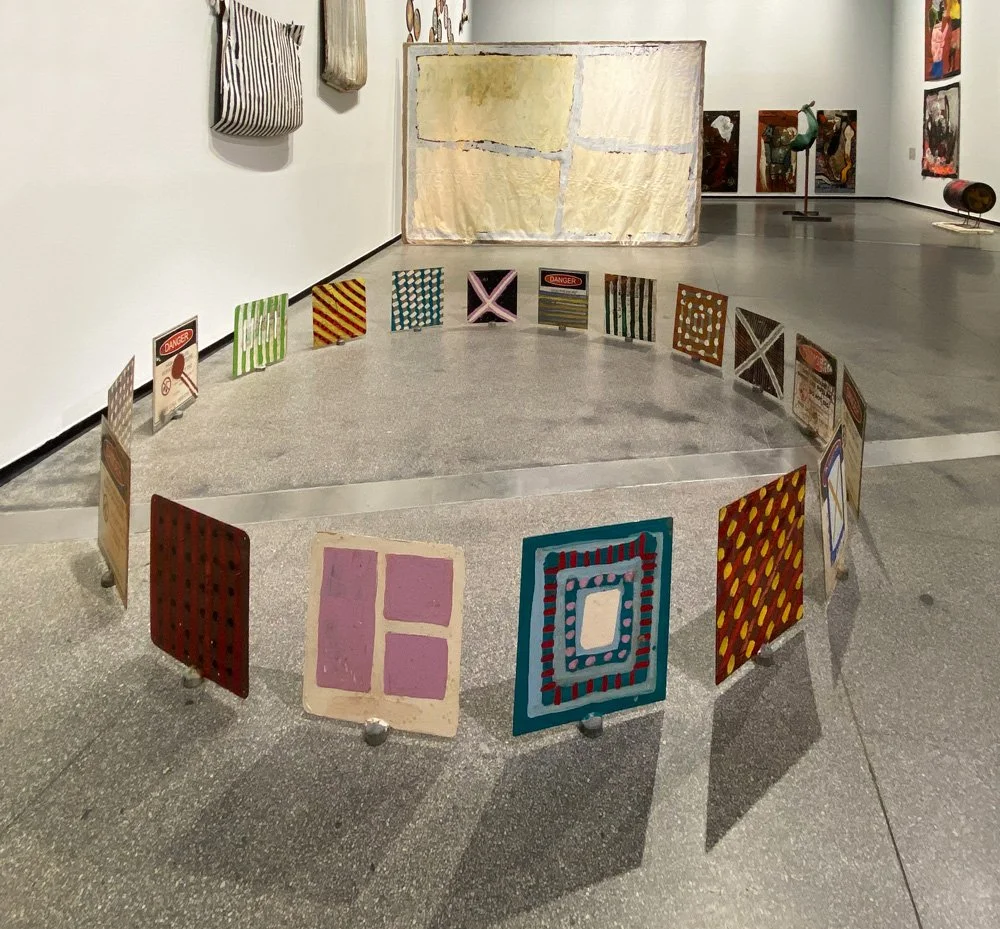 Figure 14. Tennant Creek Brio (Lindsay Nelson Jakamarra and Clifford Thompson Japaljarri), High pressure buried gas pipeline, 2023–24, oil and enamel on 18 found road signs painted (installation), 470 × 450mm (each).