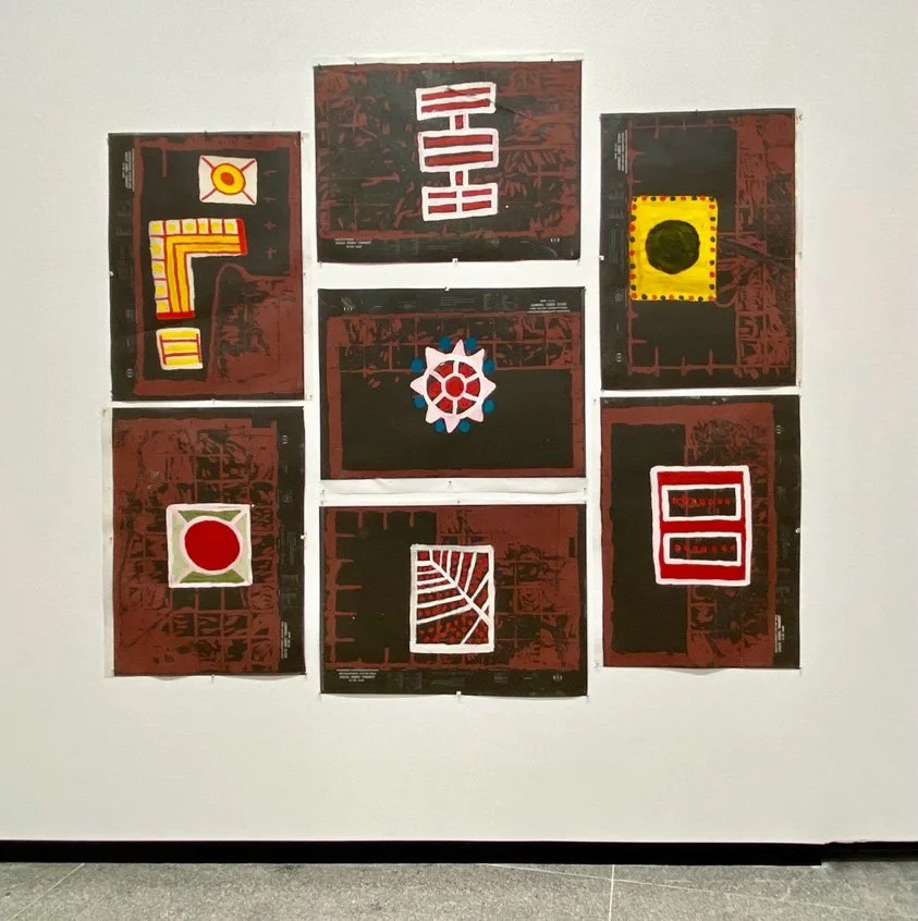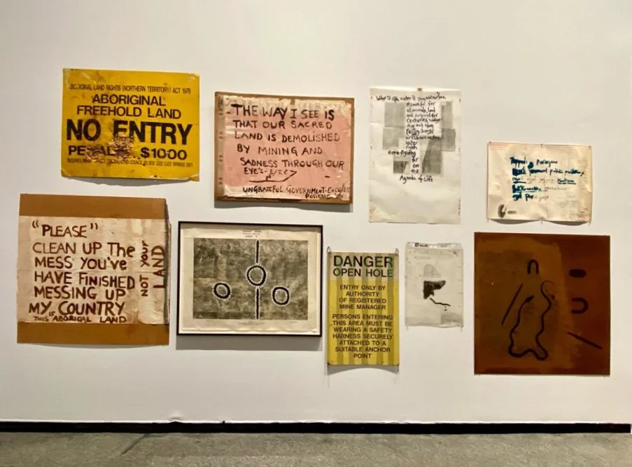 In the second room, sacred markings and political commentary were layered over mining maps from abandoned gold fields. This layering of imagery acknowledged that while extractive industries issued maps, grids and lines to divide up the land, songlines and dreamings already existed and continue to exist beyond linear Western concepts of time and place. These ancestral mappings need to be honoured, if we are to protect country and culture.